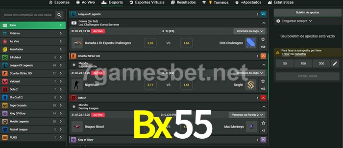 O Bx55 oferece uma grande seleção de opções de apostas em e-sports com probabilidades competitivas